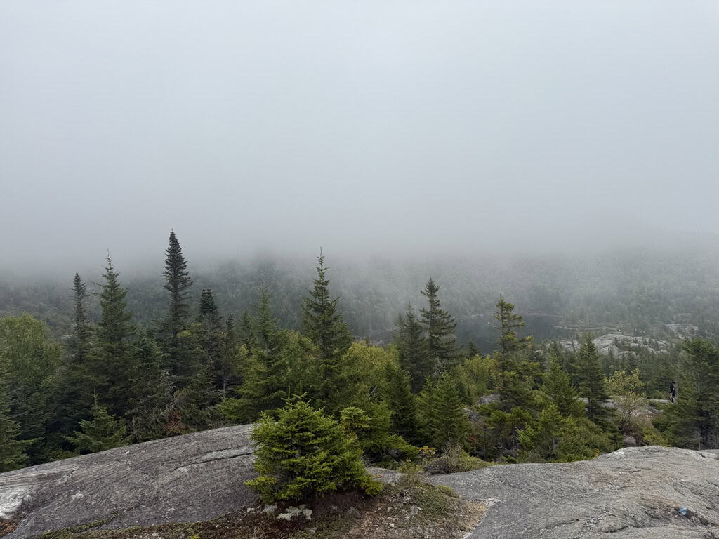 At first, the west peak rewarded us with a view of Tumbledown Pond but the fog rolled in quickly, and within 30 minutes we were fogged in.